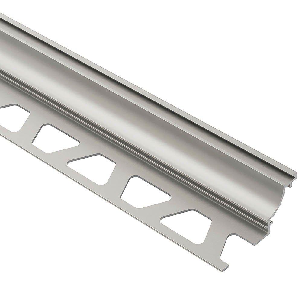 Floor/WallSchluter Dilex-Ahk Cove Base 3/8in. Aluminum Satin Nickel is a finishing and edge-protection profile for the outside corners of tiled surfaces on walls. The vertical wall section of the profile provides a decorative finish and protects adjacent tiles. Other applications include transitions for dado coverings such as carpet, natural stone, or cold-cured resin coatings.