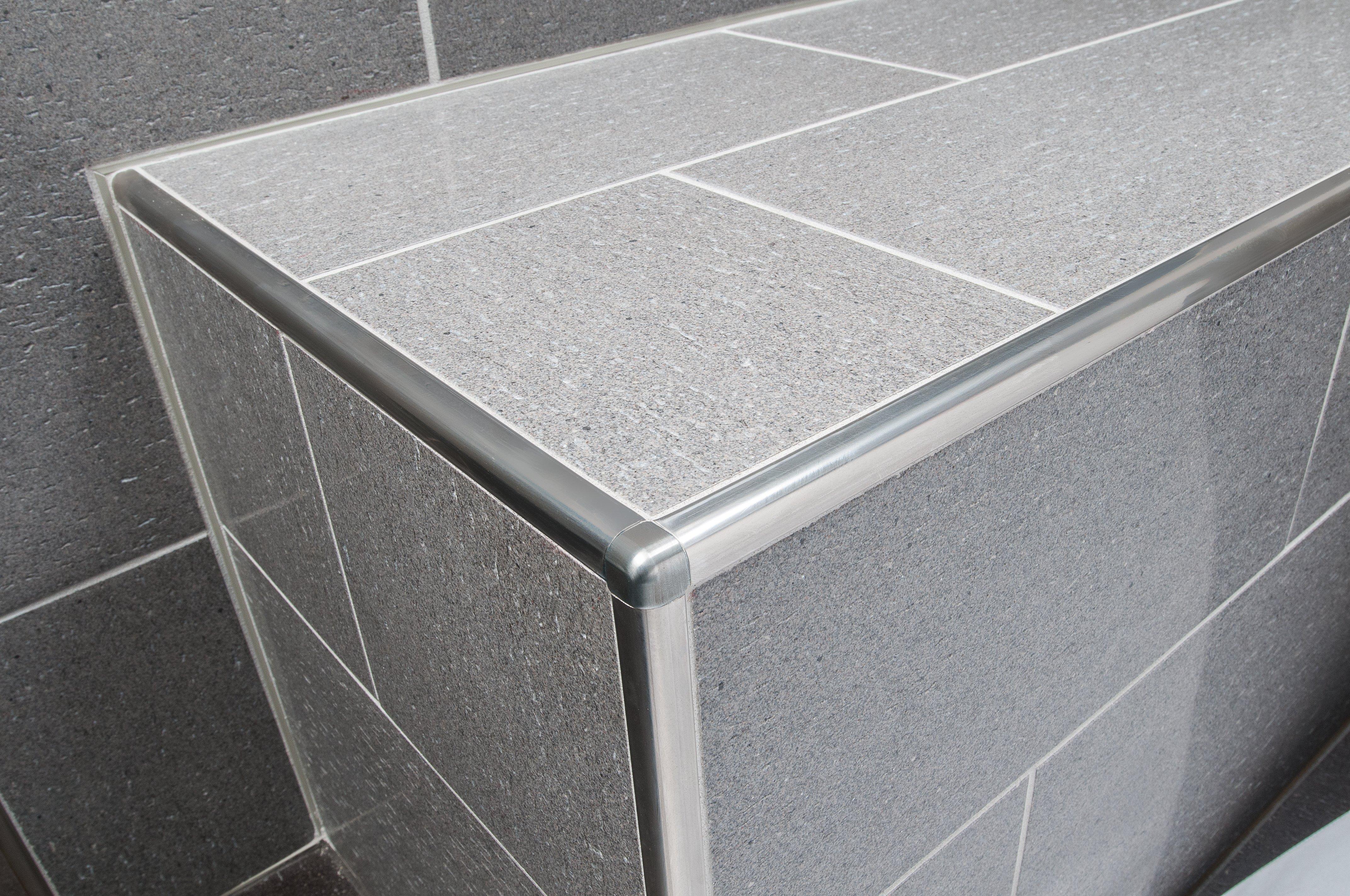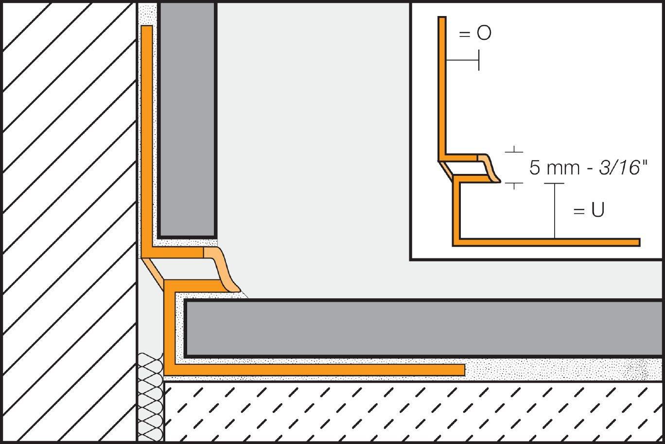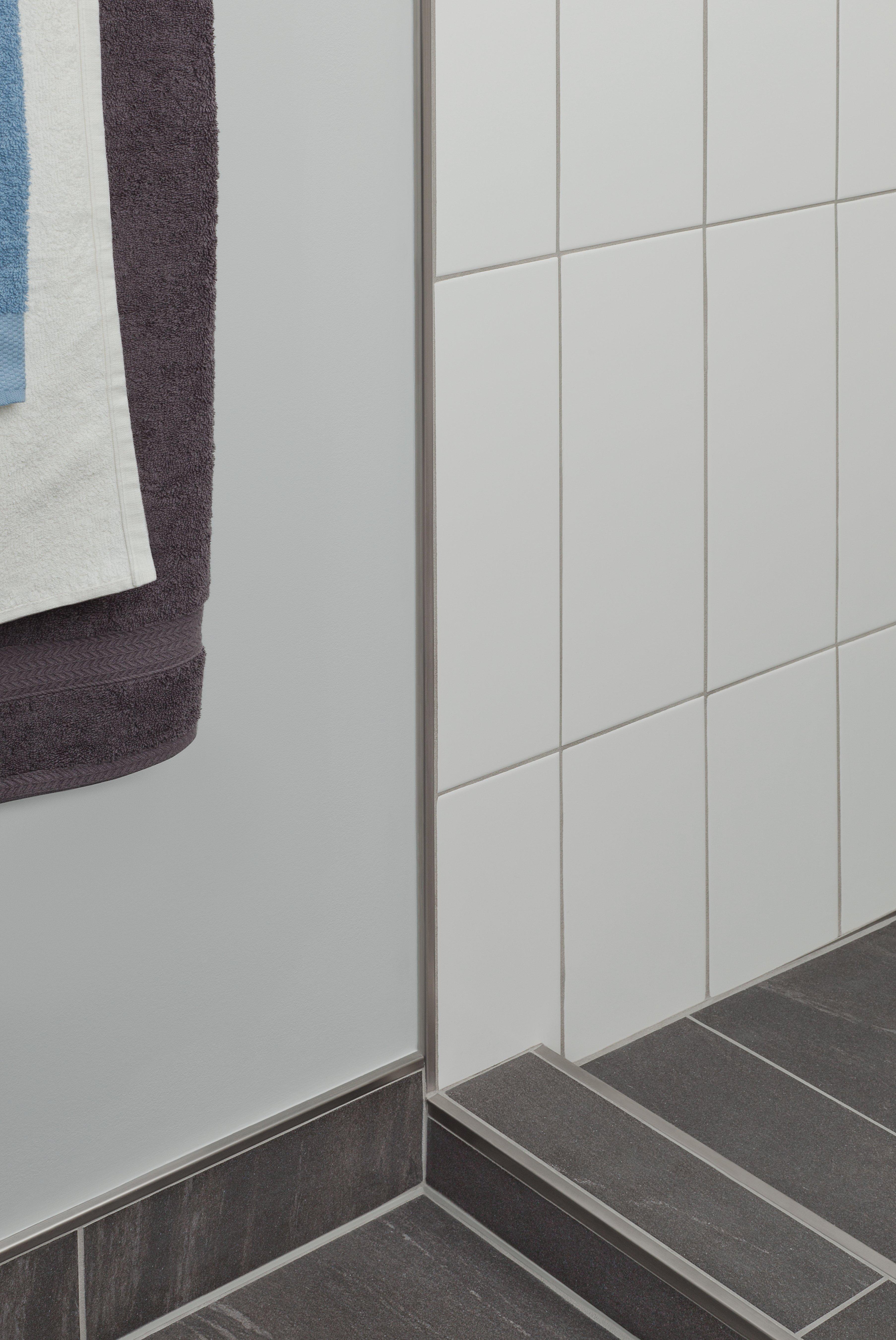 Schluter®-DILEX-EKE features trapezoid-perforated anchoring legs, made of recycled rigid PVC, which are secured in the mortar bond coat. The profile separates tile fields that meet at inside corners and accommodates movement via the 3/16" (5 mm)-wide soft chlorinated polyethylene (CPE) movement zone, which forms the visible surface and creates a discrete, uniform joint. DILEX-EKE prevents surface water penetration and features a tile pocket that hides cut tile edges. In addition, it prevents sound bridges, making it ideal for floor/wall transitions in sound-rated floors.