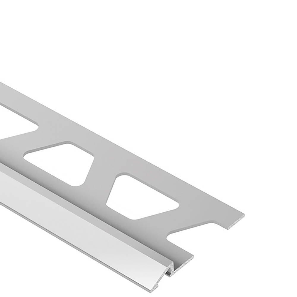 Schluter®-RENO-U is designed to provide a smooth transition between tile coverings and floor coverings at lower elevations or finished concrete. The profile is available in stainless steel, solid brass and anodized aluminum. RENO-U features a trapezoid-perforated anchoring leg, which is secured in the mortar bond coat beneath the tile, and a sloped surface (approximately 25) that eliminates trip hazards and protects tile edges. The leading edge of the profile abuts the lower surface covering, typically VCT. RENO-U, in aluminum, features an integrated joint spacer that establishes a defined joint cavity between the tile and the profile. In installations where the leading edge abuts a lower surface covering, all sizes of RENO-U, except the 3/4" (20 mm) and 11/16" (17.5 mm), are compliant with the Americans with Disabilities Act (ADA). In installations where the leading edge rests on top of the lower floor covering (e.g., finished concrete), the 3/4" (20 mm), 11/16" (17.5 mm), and 9/16" (15 mm) sizes are not ADA-compliant.