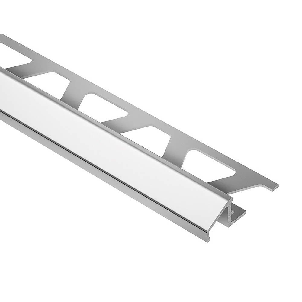Schluter®-RENO-U is designed to provide a smooth transition between tile coverings and floor coverings at lower elevations or finished concrete. The profile is available in stainless steel, solid brass and anodized aluminum. RENO-U features a trapezoid-perforated anchoring leg, which is secured in the mortar bond coat beneath the tile, and a sloped surface (approximately 25) that eliminates trip hazards and protects tile edges. The leading edge of the profile abuts the lower surface covering, typically VCT. RENO-U, in aluminum, features an integrated joint spacer that establishes a defined joint cavity between the tile and the profile. In installations where the leading edge abuts a lower surface covering, all sizes of RENO-U, except the 3/4" (20 mm) and 11/16" (17.5 mm), are compliant with the Americans with Disabilities Act (ADA). In installations where the leading edge rests on top of the lower floor covering (e.g., finished concrete), the 3/4" (20 mm), 11/16" (17.5 mm), and 9/16" (15 mm) sizes are not ADA-compliant.