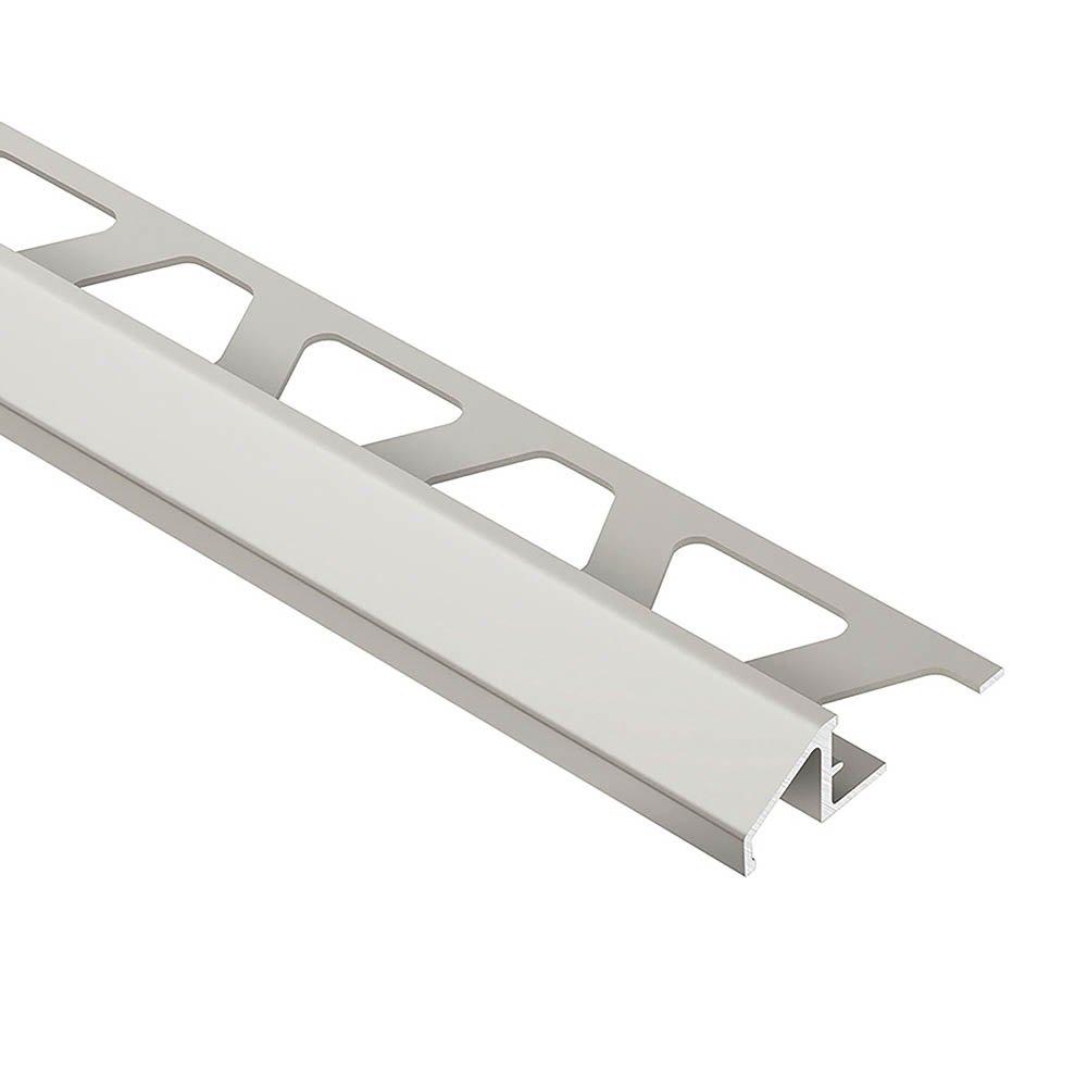 Schluter®-RENO-U is designed to provide a smooth transition between tile coverings and floor coverings at lower elevations or finished concrete. The profile is available in stainless steel, solid brass and anodized aluminum. RENO-U features a trapezoid-perforated anchoring leg, which is secured in the mortar bond coat beneath the tile, and a sloped surface (approximately 25) that eliminates trip hazards and protects tile edges. The leading edge of the profile abuts the lower surface covering, typically VCT. RENO-U, in aluminum, features an integrated joint spacer that establishes a defined joint cavity between the tile and the profile. In installations where the leading edge abuts a lower surface covering, all sizes of RENO-U, except the 3/4" (20 mm) and 11/16" (17.5 mm), are compliant with the Americans with Disabilities Act (ADA). In installations where the leading edge rests on top of the lower floor covering (e.g., finished concrete), the 3/4" (20 mm), 11/16" (17.5 mm), and 9/16" (15 mm) sizes are not ADA-compliant.