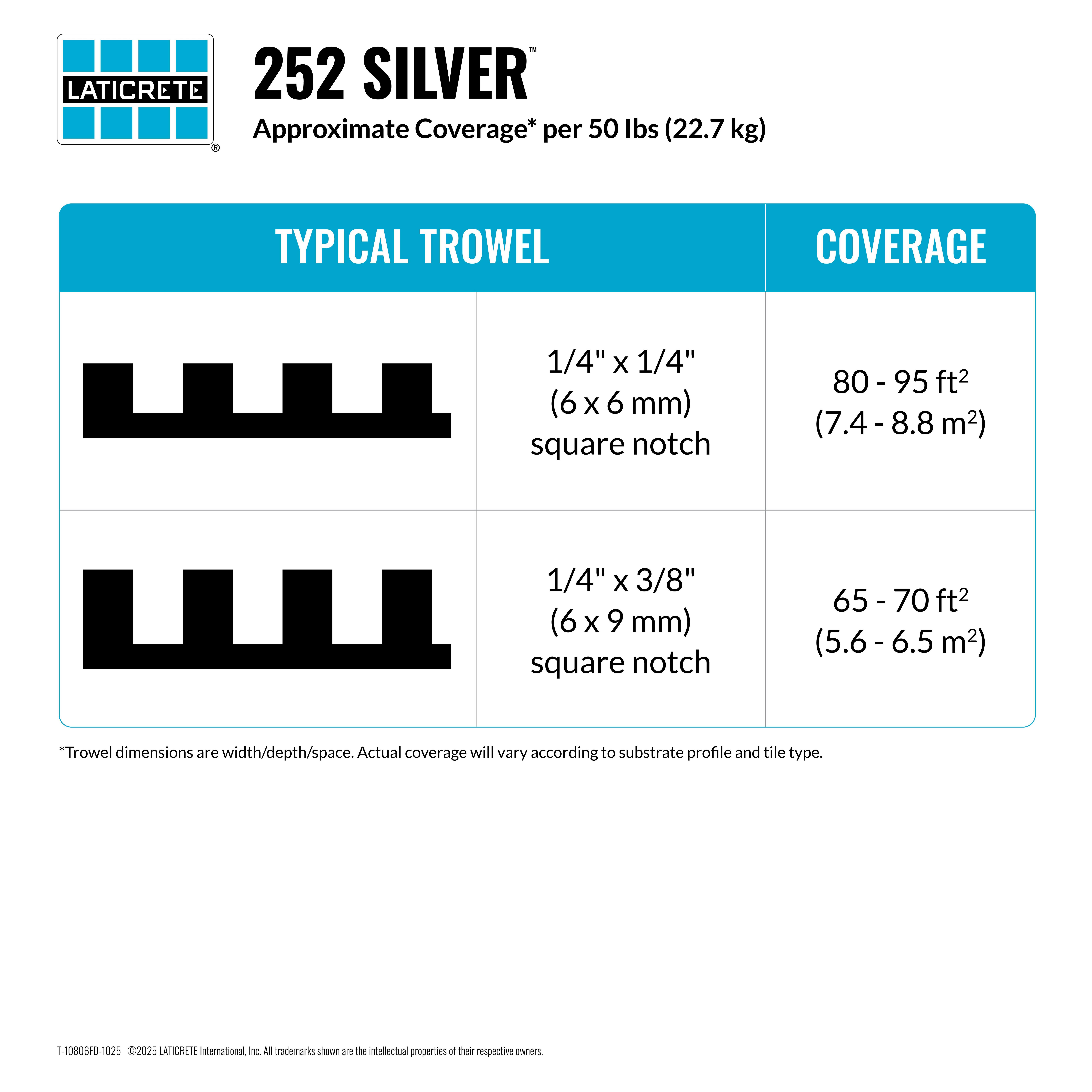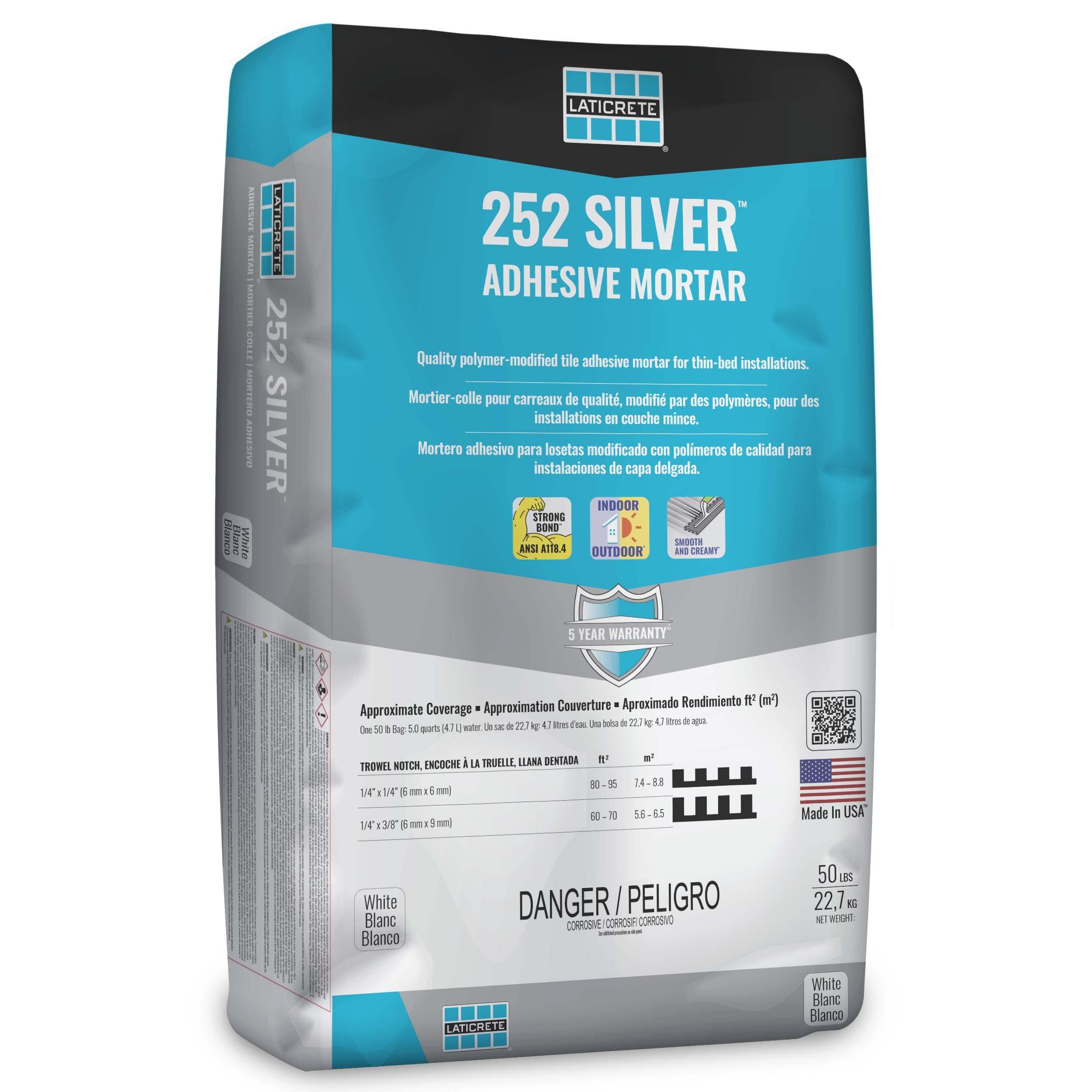 Laticrete 252 Silver White is an economical, polymermodified thin-set mortar designed for reliable performance on a wide variety of tile installations. This easy-to-mix formula is suitable for both interior and exterior floors and walls, offering strong adhesion with excellent coverage.