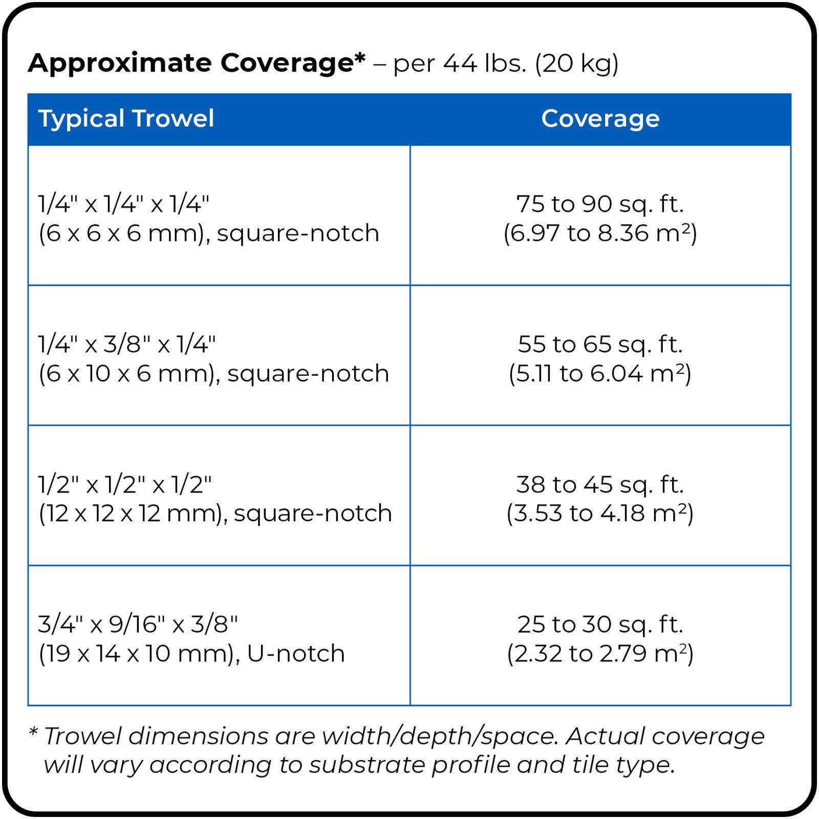 The estimated amount of coverage based on product size and manufacturer’s recommend (or commonly used) install application.