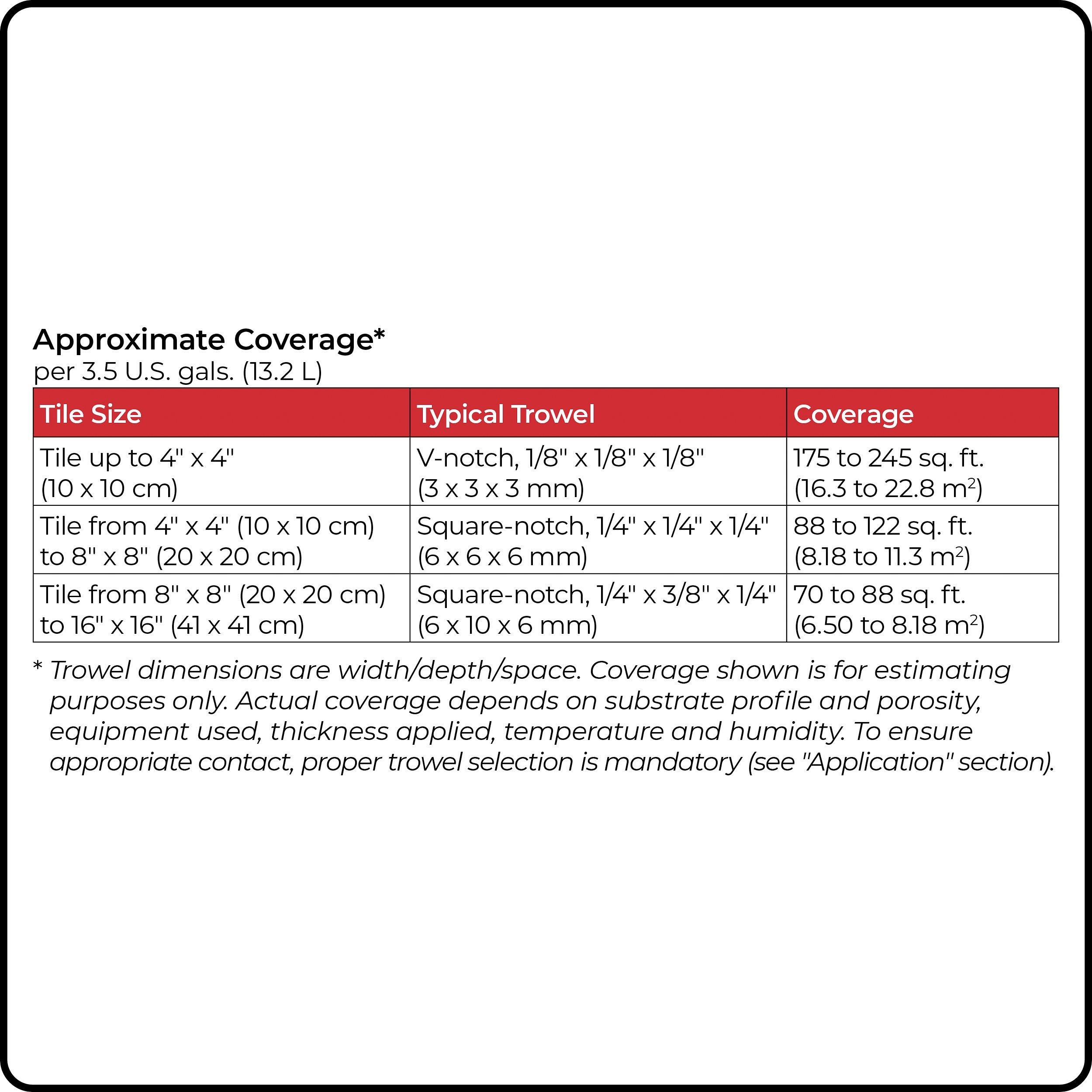 Ideal for installing non-moisture-sensitive marble, granite, slate, and most ceramic, quarry, and porcelain tiles in indoor residential and commercial settings. Suitable for floor and wall tile up to 16" x 16" (41 x 41 cm) and ceiling tile up to 6" x 6" (15 x 15 cm) in dry or intermittent wet areas such as countertops, backsplashes, tub surrounds, and shower walls.