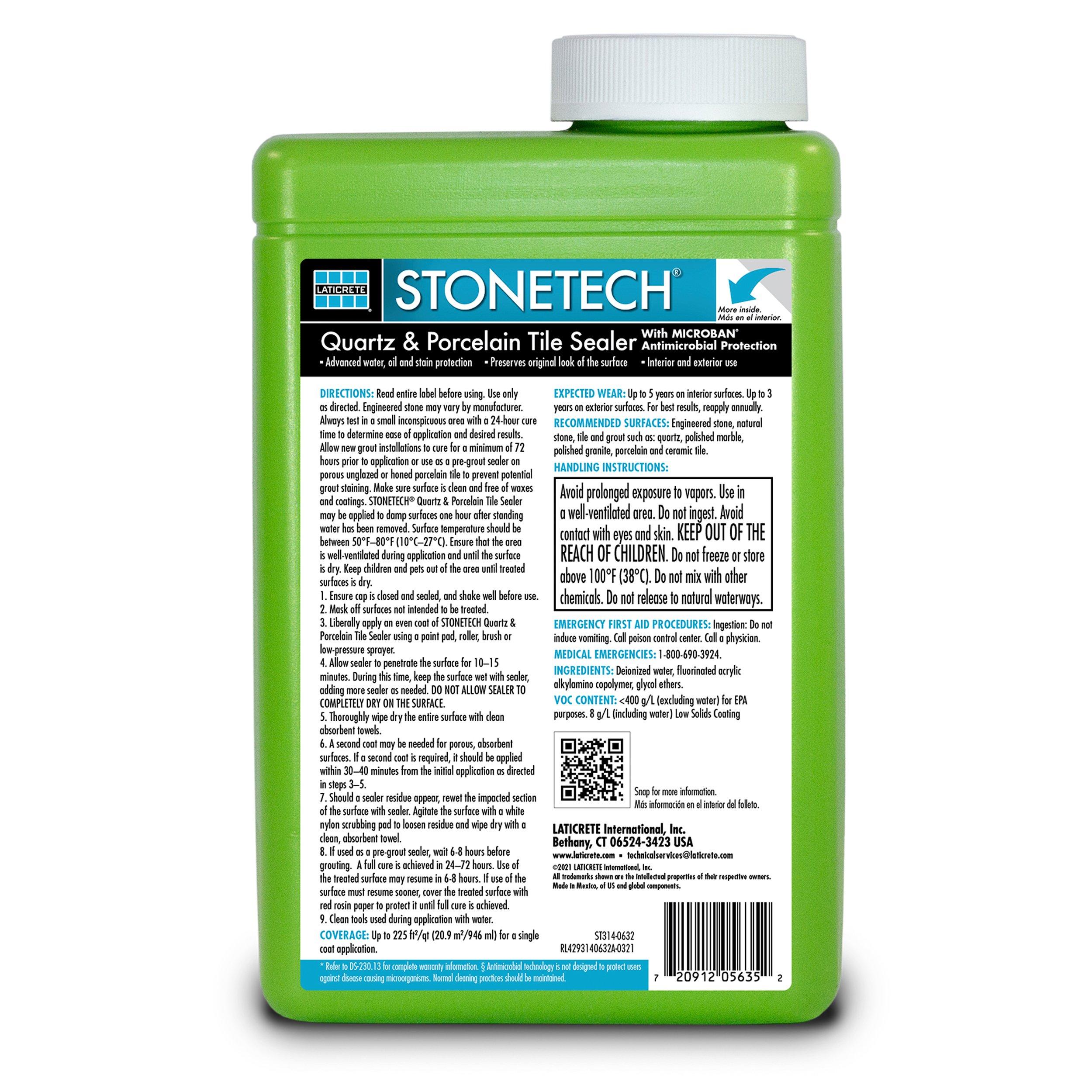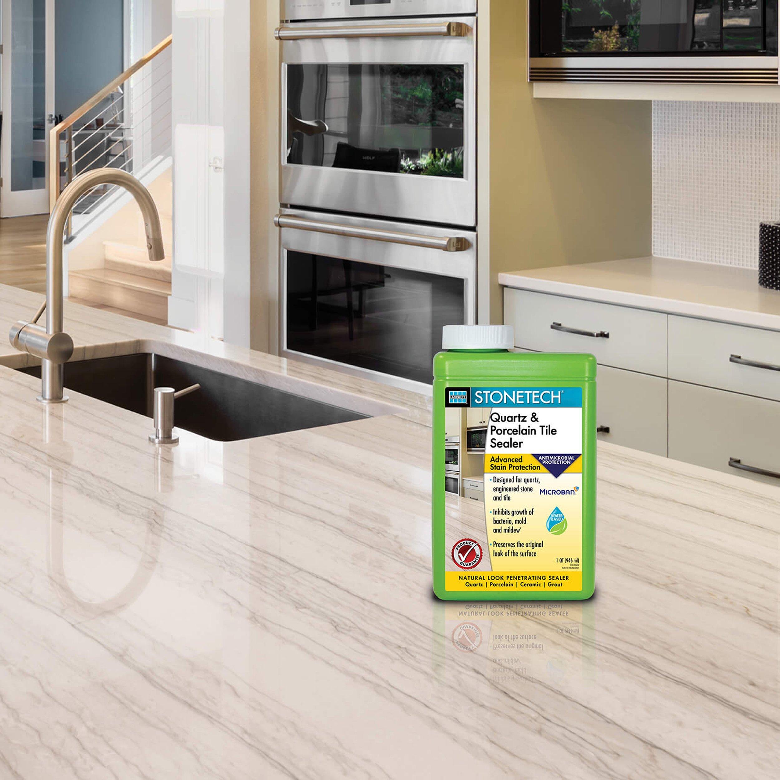 STONETECH Quartz & Porcelain Tile Sealer is designed to protect quartz, porcelain tile and medium to dense surfaces from oil, water and most stains, all while preserving the natural look of the surface. STONETECH Quartz & Porcelain Tile Sealer can also be used as a pre-grout sealer.