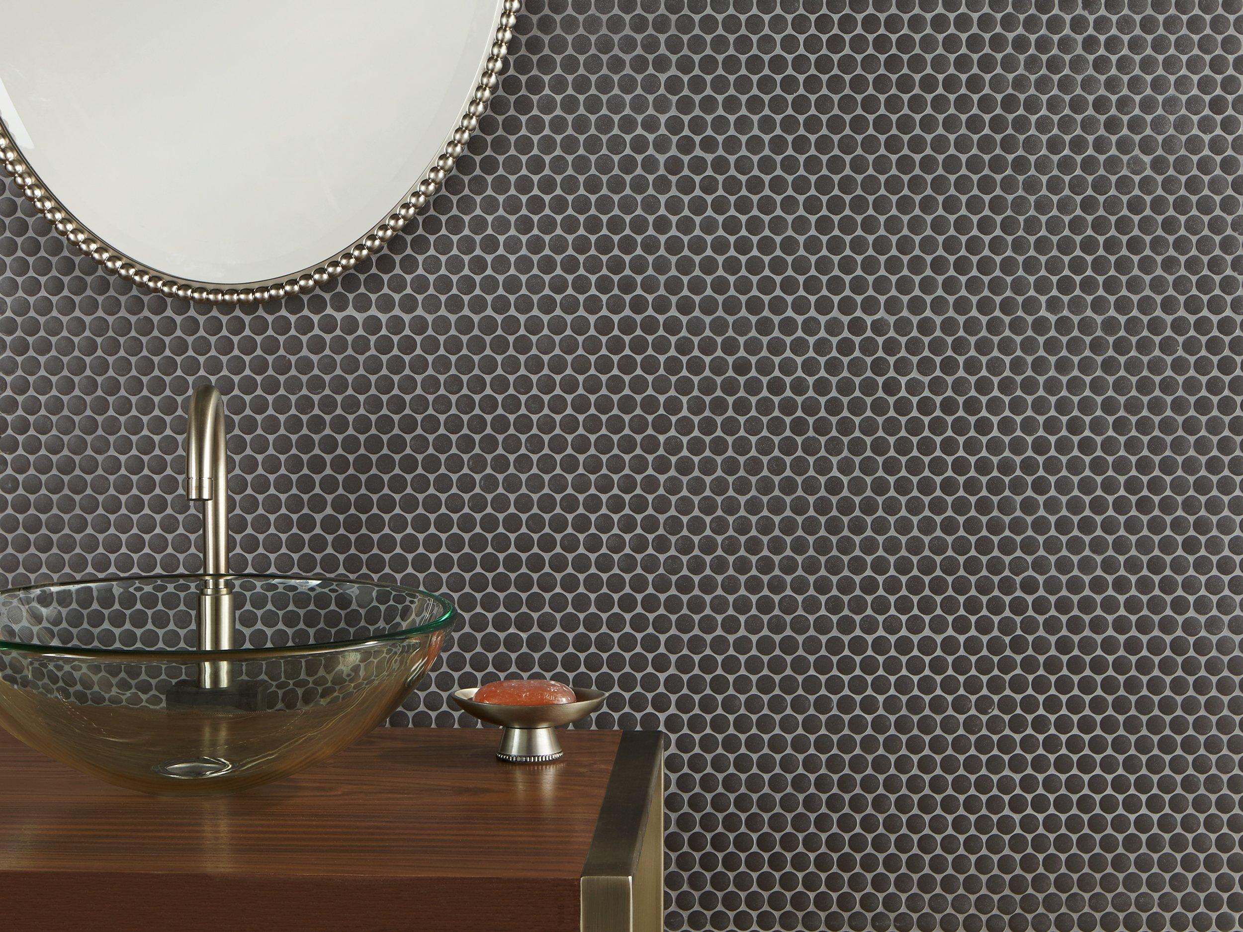 The round tile in this mosaic can be used as a playful accent piece, or in large spaces for a subtle design.