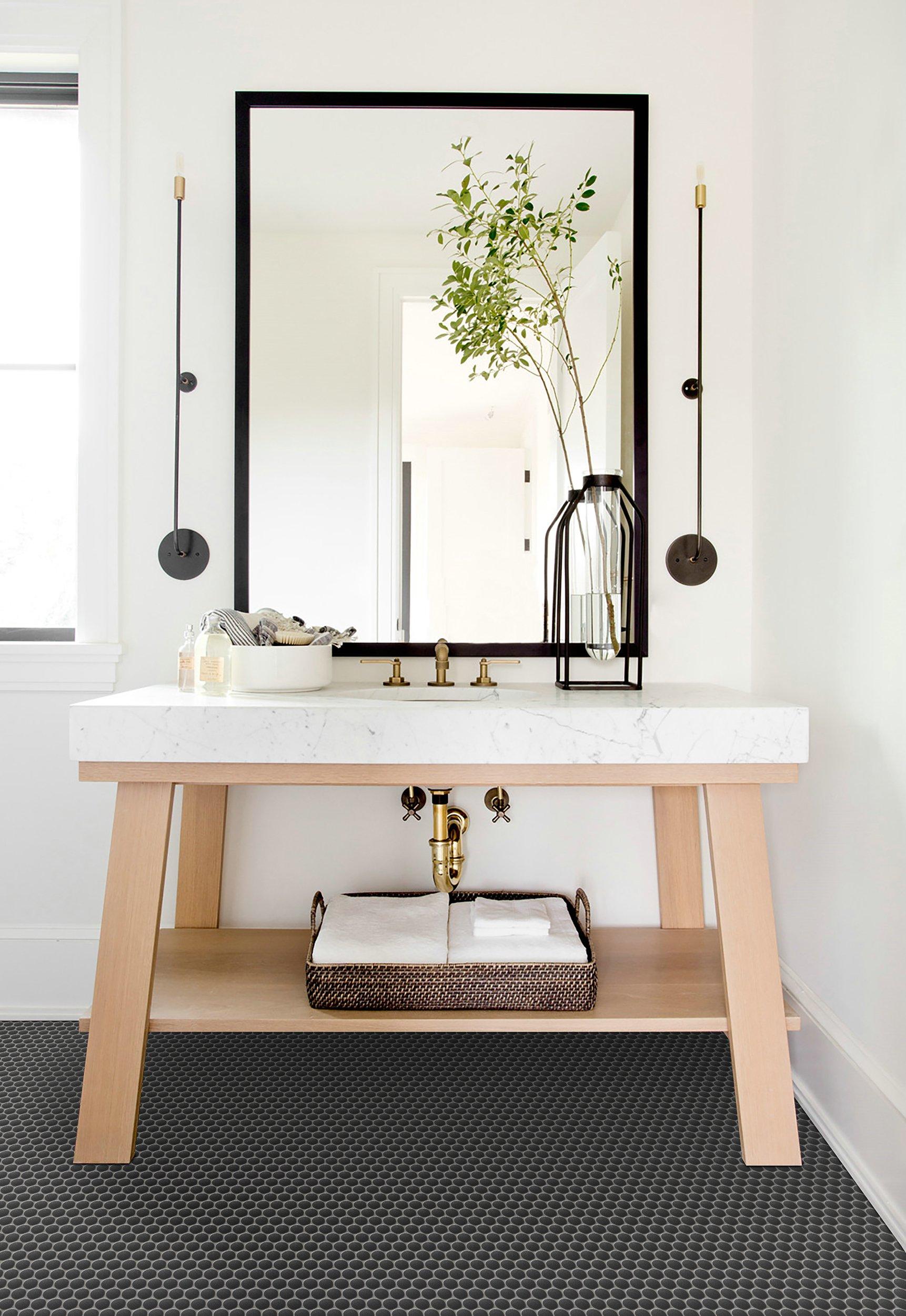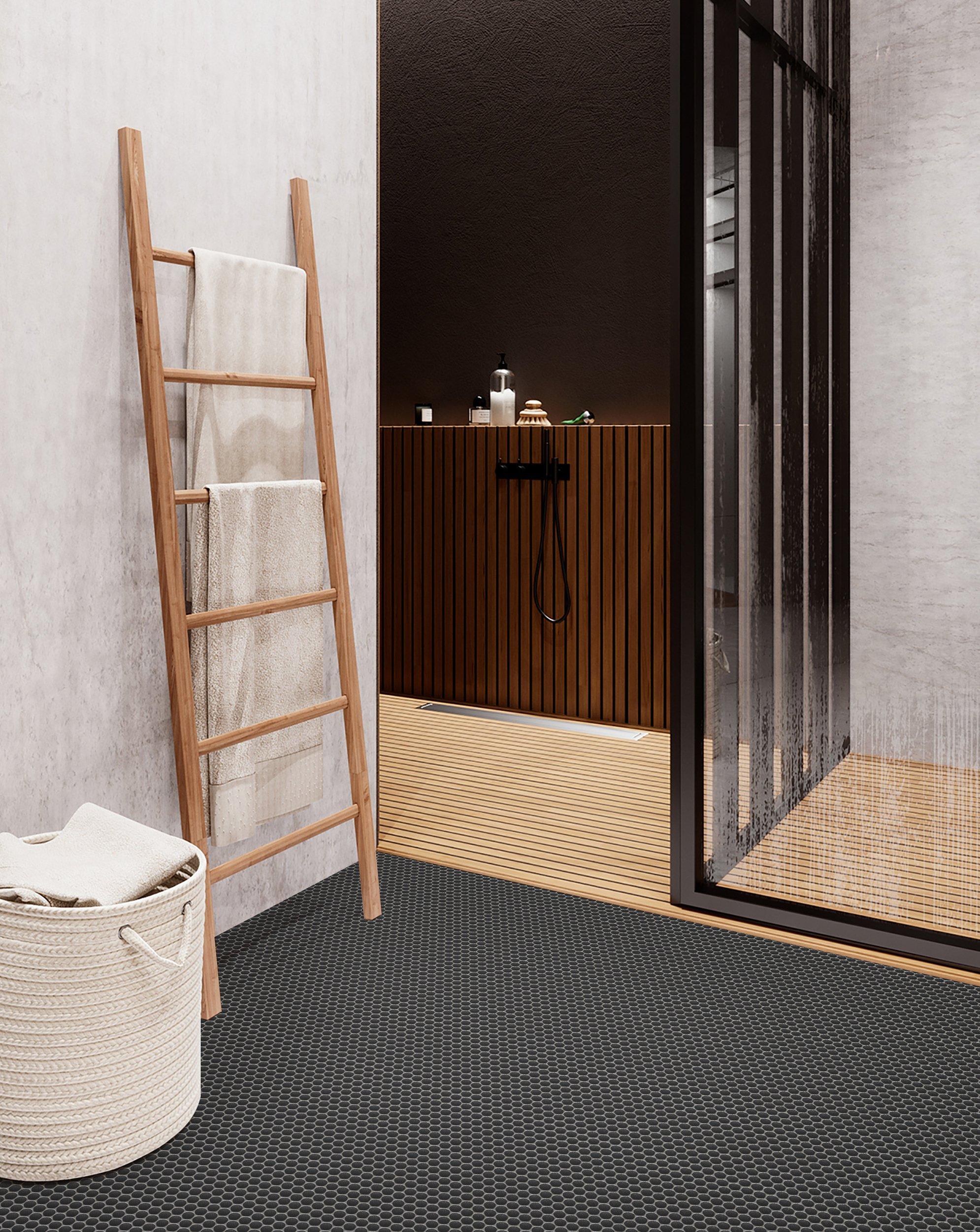 Personalize your space with the 12 x 12 Unglazed Charcoal Penny Porcelain Mosaic. This gray matte finish tile will make a great impact in small areas like the bathroom, den, or other overlooked spaces.