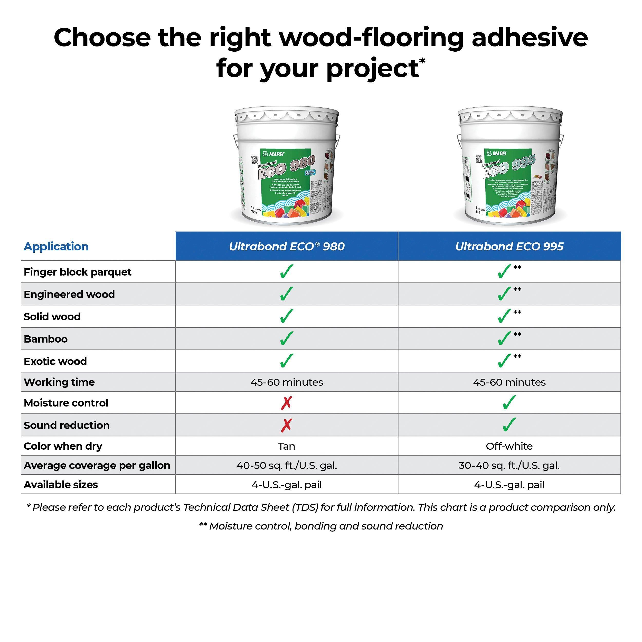 United States of AmericaMapei Ultrabond Eco 980 Wood Flooring Adhesive is a 100%-solids, one-component, moisture-cured urethane adhesive designed for installing domestic and exotic solid and engineered wood flooring, including bamboo. Its durable bond strength and low-odor, low-VOC formula make it ideal for residential and commercial wood flooring projects.